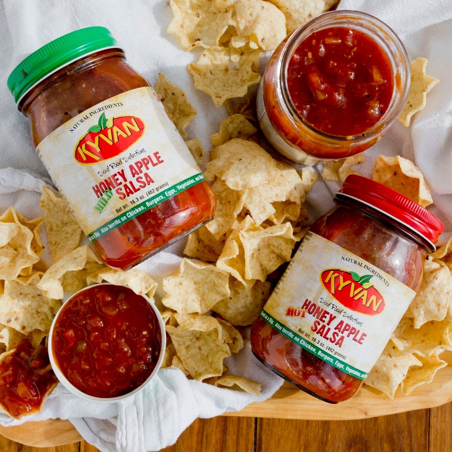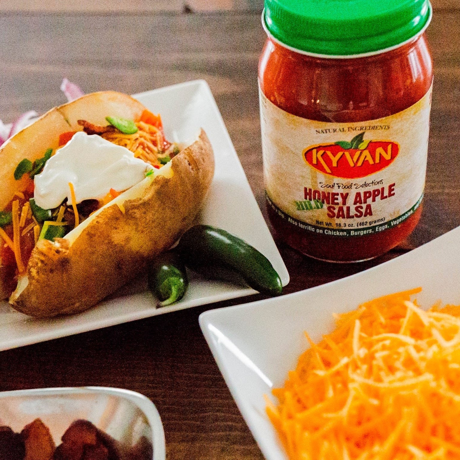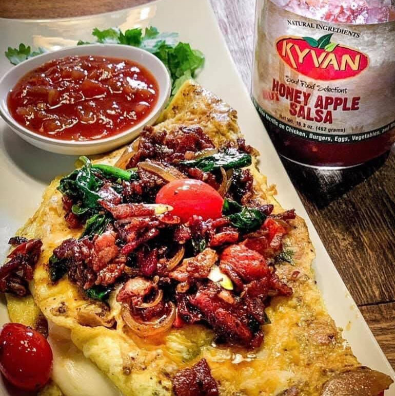 Mild Honey Apple Salsa: This slowly simmered, premium salsa featuring fresh robust tomatoes and peppers is a sure way to excite your tastebuds. With a touch of honey combined with an array of spices, KYVAN salsa is a great compliment to any dish. Unlike typical salsas that we commonly see, it has a refreshing southern taste mixed with apples and fresh vegetables. One taste and the possibilities become unlimited.