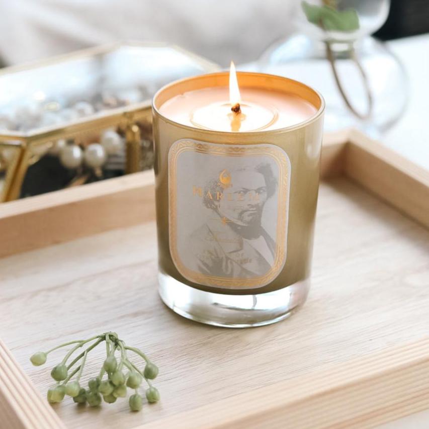 1 Frederick Candle - Inspired by Frederick Douglass, our "Frederick" candle pays loving tribute to a brave and charismatic man who passionately followed his dream of a world of freedom for all. Infused with fruits and botanicals, we’ve re-imagined the orangerie from Douglass’s childhood to include juicy bergamot, yuzu, and fresh green cardamom which sets the stage for a heart of vanilla orchid, cypress, and ginger blossom. A liberating base of suede, sandalwood, and tonka bean add warmth and depth to this elegant and uplifting blend.